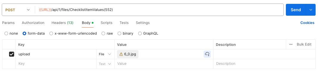 The third step is to upload the file into the checklist item values object. To do so, send a POST request to the following URL: